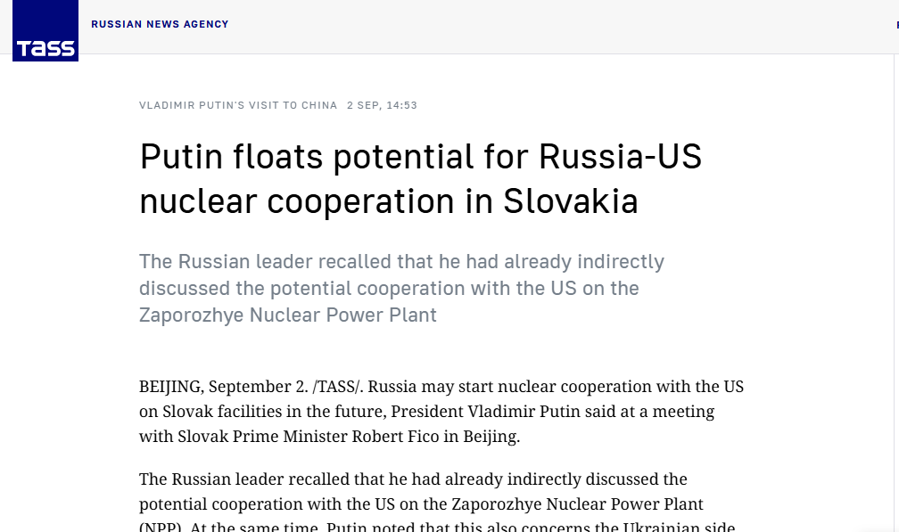 وخلال اجتماع مع رئيس الوزراء السلوفاكي روبرت فيكو في بكين أشار الرئيس الروسي إلى أنه سبق أن ناقش بشكل غير مباشر إمكانية التعاون مع الولايات المتحدة بشأن محطة زابوروجي للطاقة النووية.