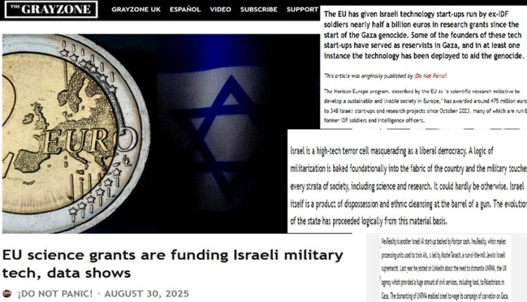 كشف موقع “ذا جراي زون” البريطاني المستقل، في تقرير استقصائي نُشر في 30 أغسطُس الماضي، أن الاتّحاد الأُورُوبي قدّم ما يقارب 475 مليون يورو لشركات تكنولوجية إسرائيلية منذ أُكتوبر 2023، في إطار برنامج “هورايزون” للتمويل البحثي، رغم الانتهاكات الجسيمة التي ترتكبها (إسرائيل) في قطاع غزة.