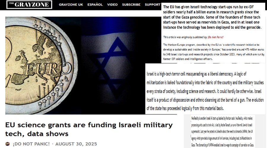 وأشَارَ الموقع إلى أن إسرائيل، التي وصفها بـ”الخلية الإرهابية المتطورة تقنيًا”، تُوظف العلم والتكنولوجيا كأدَاة من أدوات القوة الناعمة لشرعنة احتلالها وسياساتها العنصرية، في حين يُستخدم التمويل الأُورُوبي لدعم قطاع يُشكّل “جوهرة التاج” في اقتصاد الكيان، ويُدرّ مليارات الدولارات على الدولة العبرية.