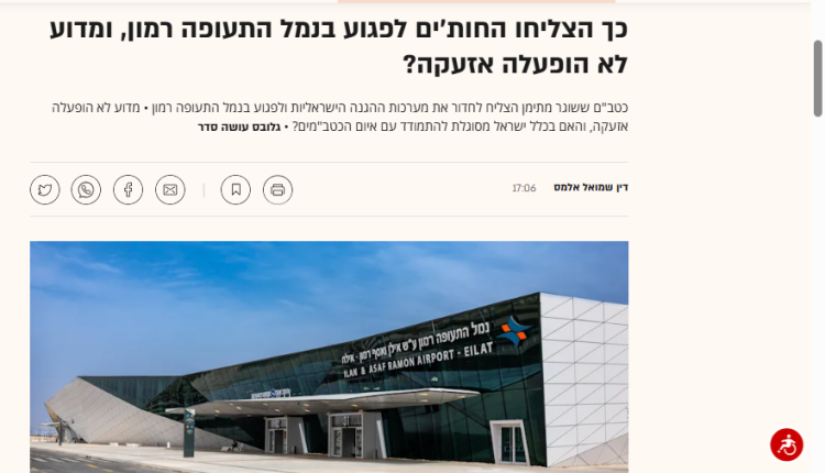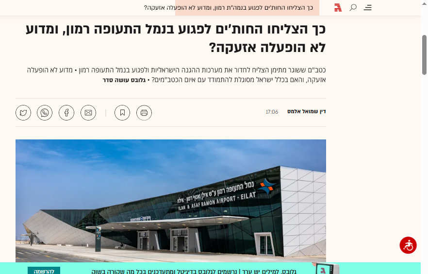 قال تقرير مساء اليوم الأحد لـصحيفة غلوبس العبرية أن الحوثيين نجحوا اليوم  في قصف مطار إسرائيلي جديد، للمرة الثانية خلال أربعة أشهر – وهذه المرة كان الهدف رامون ، ودون سابق إنذار.