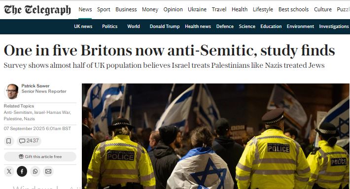 كشف استطلاع رأي جديد نشرته صحيفة التلغراف البريطانية، أن 45 % من البريطانيين يعتقدون أن “إسرائيل” تعامل الفلسطينيين كما عامل النازيون اليهود، في نسبة غير مسبوقة مقارنة بـ33 % العام الماضي، وفقًا لبيانات حملة مناهضة معأدَاة السامية (CAA).