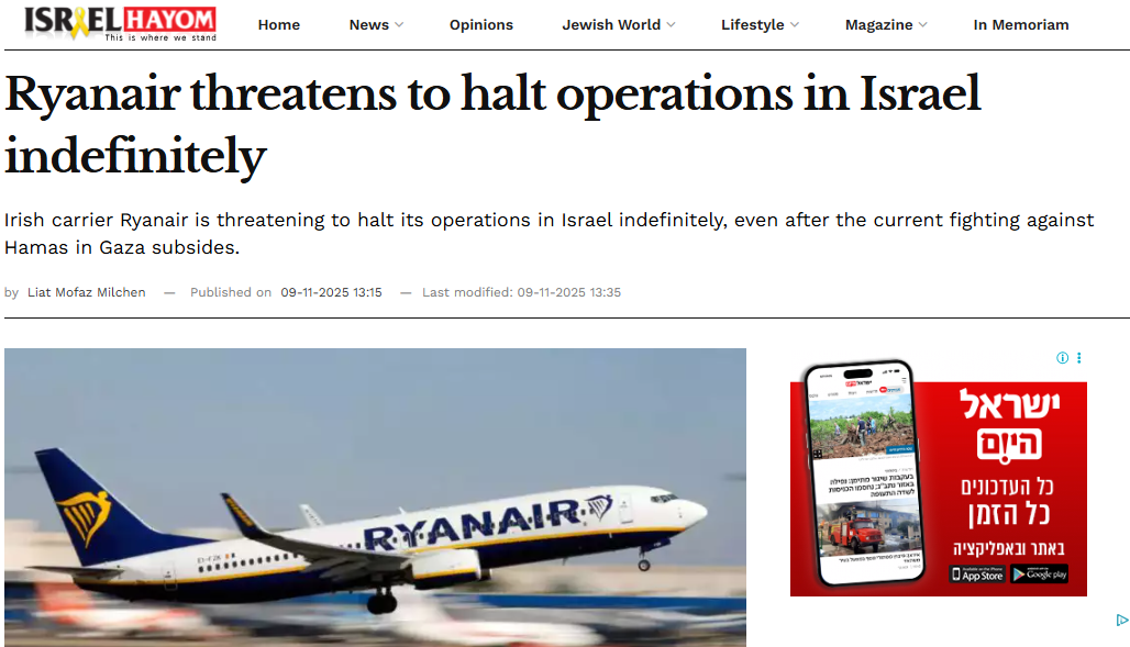 هددت شركة رايان إير الأيرلندية للطيران منخفض التكلفة بوقف عملياتها في إسرائيل إلى أجل غير مسمى، حتى بعد انتهاء الحرب الحالية في غزة.