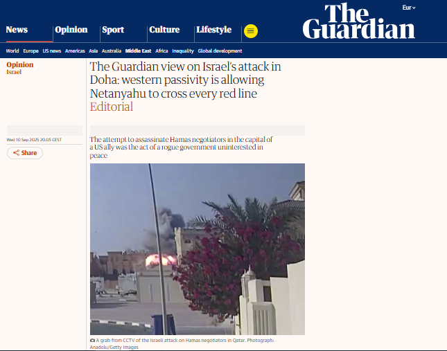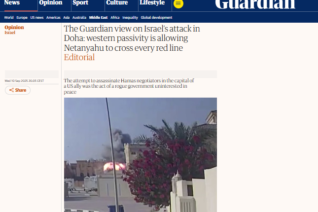 نشرت صحيفة The Guardian البريطانية افتتاحية بعنوان ((السلبية الغربية تسمح لنتنياهو بتجاوز كل الخطوط الحمراء)) وهذا نصها :