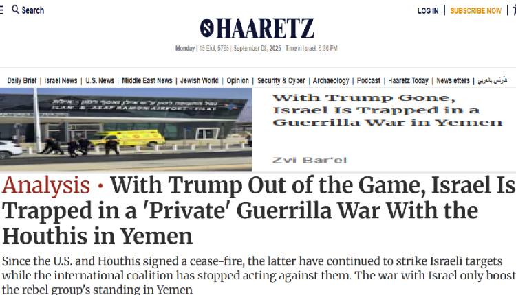 وكشفت صحيفة “هآرتس” العبرية في تقرير تحليلي موسّع، مؤخرًا، أن كيان الاحتلال الإسرائيلي بات يجد نفسه وحيدًا في مواجهة خطر المسيّرات والصواريخ اليمنية، في ظل ما وصفته الصحيفة بـ”غياب الدعم الأمريكي”، ما دفعه للبحث عن “استراتيجيات بديلة وإبداعية” للتعامل مع هذا التهديد المتصاعد من اليمن.