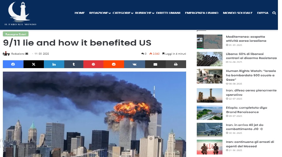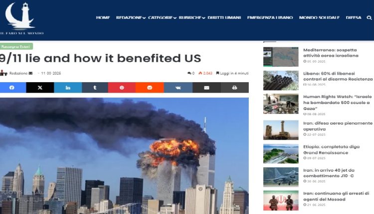 نشرت المجلة الإيطالية المستقلة “Il Faro sul Mondo” تقريرًا مطولًا يشكك في الرواية الرسمية لهجمات 11 سبتمبر/أيلول 2001، ويصفها بأنها “حادثة مُستغلَّة سياسيًا” استُخدمت كذريعة لشن سلسلة من التدخلات العسكرية في الشرق الأوسط، وفق تحليلات استندت إلى وثائق وشهادات ومراجع أكاديمية.