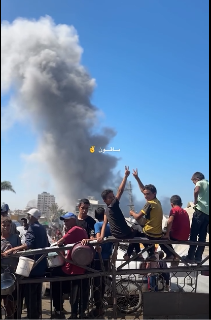 أظهرت مقاطع نشرتها حسابات فلسطينية ،  أطفال في قطاع غزة وهم ينتظرون أمام احد “التكيات” التي توزع الطعام أثناء غارة “إسرائيلية” قريبة منهم.