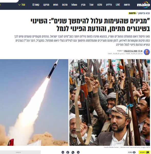 ونقل الموقع العبري، عن خبير عسكري إيراني معارض، أن ” الحوثيين يمتلكون كميات كبيرة من المسيّرات والصواريخ بمختلف أنواعها، لكنهم يدركون أن هذا الصراع قد يستمر لسنوات”.