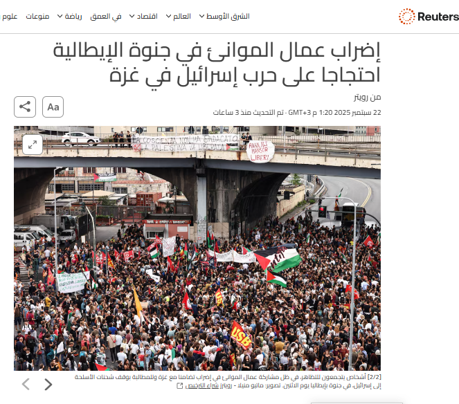 رويترز: عمال الموانئ في جنوى الإيطالية يغلقون الطرق إلى الميناء في إطار اضراب مناهض للحرب على غزة