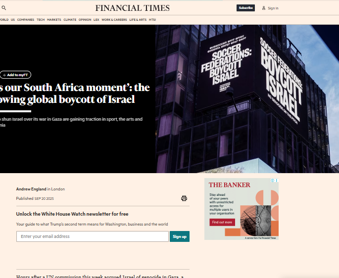 قال تقرير لصحيفة “فايننشال تايمز” البريطانية: بعد ساعات من اتهام لجنة الأمم المتحدة هذا الأسبوع لإسرائيل بارتكاب إبادة جماعية في غزة، ظهرت لوحة إعلانية عملاقة في ساحة تايمز سكوير في نيويورك تكرر نفس الاتهام لكل من يمر عبر تقاطع المشاة الأكثر ازدحاما في المدينة.