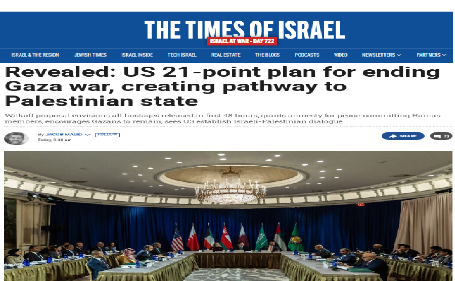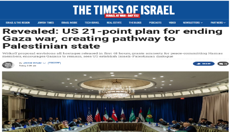 نشرت “تايمز أوف إسرائيل” تقريرًا حول ما أسمته تفاصيل خطة من 21 بندًا قدمها الرئيس الأمريكي دونالد ترامب بشأن غزة، وهي الخطة التي تم عرضها على عدد من القادة العرب والمسلمين في اجتماع عُقد بنيويورك بعد كلمته في الأمم المتحدة. الخطة، التي وضعها ستيف ويتكوف، المبعوث الأمريكي للمنطقة، قوبلت بترحيب حذر من بعض هؤلاء الزعماء، لكن تسريباتها أثارت جدلاً واسعًا حول هدفها الحقيقي.