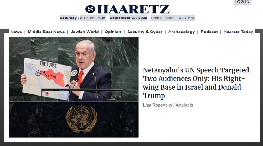 في تقرير لاذع نشرته صحيفة هآرتس الإسرائيلية صباح اليوم، وصفت فيه خطاب رئيس وزراء الكيان الصهيوني بنيامين نتنياهو أمام الجمعية العامة للأمم المتحدة بأنه “مكرّر وفارغ”، مؤكّـدة اعتماده الكامل على الرئيس الأمريكي دونالد ترامب دون تقديم أية رؤية جديدة للعالم.