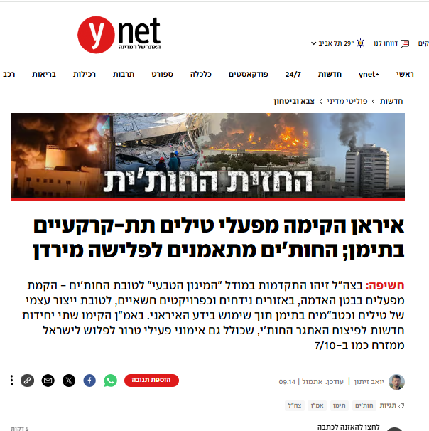في الأشهر الأخيرة، رصدت المؤسسة الأمنية تقدمًا ملحوظًا في قدرات الحوثيين في اليمن، سواءً في التصنيع الذاتي للطائرات المُسيّرة والصواريخ بعيدة المدى المتطورة، بالاعتماد على خبرة إيرانية وبمساعدة مهندسين محليين، أو في استخدام الأنفاق لإنتاجها وتخزينها.