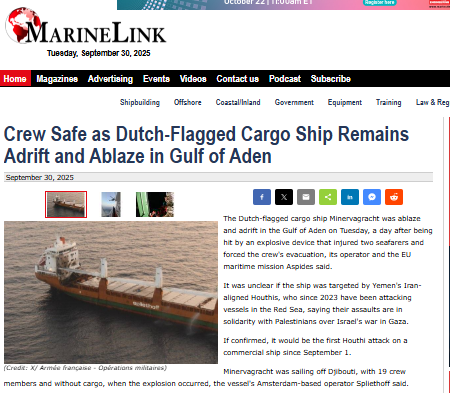قالت مجلة مارلين ترافيكأن معظم أفراد طاقم السفينة التي ترفع العلم الهولندي المستهدفة في خليج عدن بمن فيهم أحد البحارة المصابين الذي في حالة مستقرة تم نقلهم إلى فرقاطة يونانية وفرنسية .