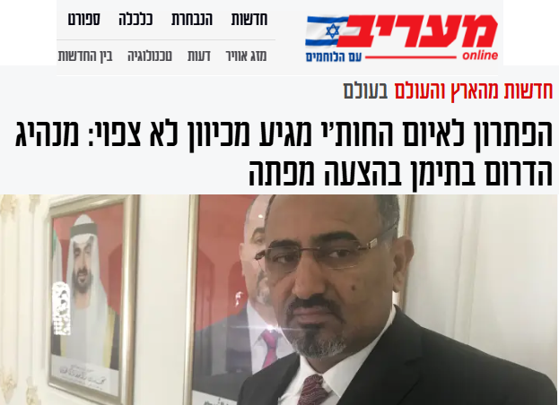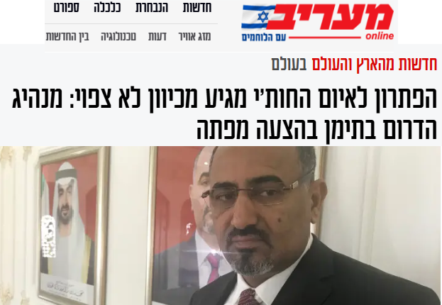 أثار تقريرٌ نشرته صحيفة معاريف العبرية، نقلًا عن مقابلات مع رئيس ما يُعرف بـ”المجلس الانتقالي الجنوبي” عيدروس الزبيدي، موجة غضب واستنكار واسع في الأوساط اليمنية، بعد أن كشف عن عرض صريح قدمه الزبيدي لـ”إسرائيل”، يتضمن تطبيعًا رسميًّا وتحالفات في حال نجاح مشروع انفصال جنوب اليمن.