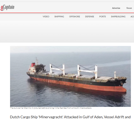 تعرضت سفينة شحن هولندية تُدعى MV Minervagracht لهجوم بـ”صاروخ باليستي” على بعد حوالي 120 ميلاً بحرياً من مدينة عدن اليمنية.