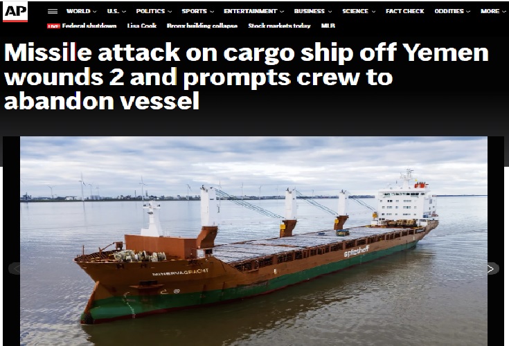 ووفقًا لتقرير الوكالة، فإنَّ السفينة -تعود ملكيتُها لشركة شحن دولية، تتعامل مع كَيان الاحتلال الصهيوني، الذي يرتكب جرائمَ إبادة وتهجير في غزة- تعرَّضت لأضرار بالغة نتيجة الهجوم أثناء مرورها في خليج عدن، مما تسبب في اشتعال النيران فيها وإصابة اثنين من طاقمها، بالإضافة إلى جنوحها.