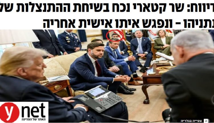 كشفت صحيفة يديعوت أحرونوت العبرية أن لقاءً غيرَ معلن جرى بين رئيس الوزراء الإسرائيلي بنيامين نتنياهو ومسؤول قطري رفيع المستوى في البيت الأبيض، عقب محادثة اعتذار بين نتنياهو ورئيس الوزراء القطري محمد بن عبد الرحمن آل ثاني، عُقدت الأسبوع الماضي في المكتب البيضاوي.