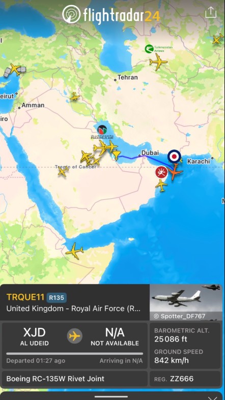 وأظهرت مواقعُ تتبع الملاحة الجوية أن الطائرةَ من طراز RAF RC-135W Rivet Joint، وهي طائرة مخصصة لعمليات التجسس وجمع الإشارات، أقلعت من قاعدة العديد الجوية في قطر، وظلت تحلق لساعات في أجواء خليج عدن قبالة السواحل اليمنية.