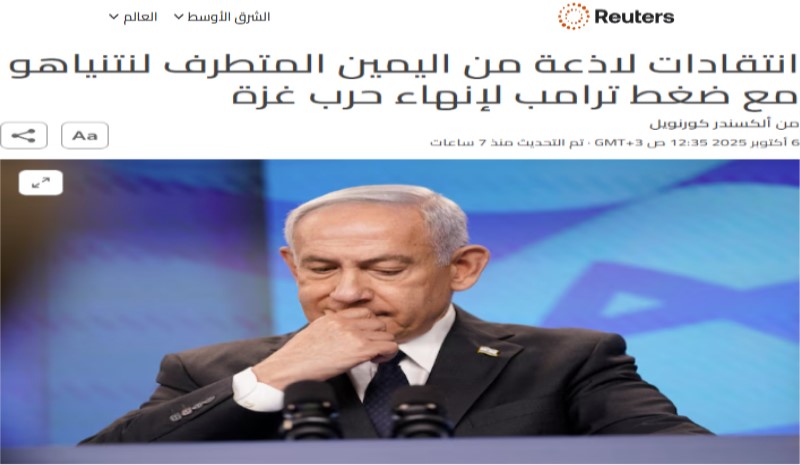 وبحسب وكالة رويترز، فإن نتنياهو يواجه ردود فعل عنيفة وانتقادات حادة من شركائه في الائتلاف الحاكم من غلاة القوميين، إثر قبوله خطة ترامب المؤلفة من 20 نقطة لإنهاء الحرب، والتي تدعو إلى نزع سلاح القطاع واستبعاد أي دور مستقبلي لحركة المقاومة الإسلامية (حماس) في الحكم، مع السماح لأعضائها بالبقاء إذَا نبذوا العنف وسلموا أسلحتهم.