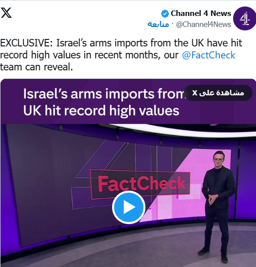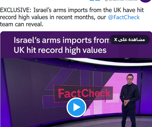 القناة اللندنية الرابعة: واردات الأسلحة البريطانية إلى “إسرائيل” تسجل رقما قياسياً