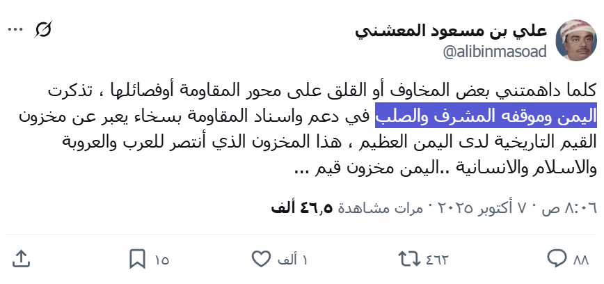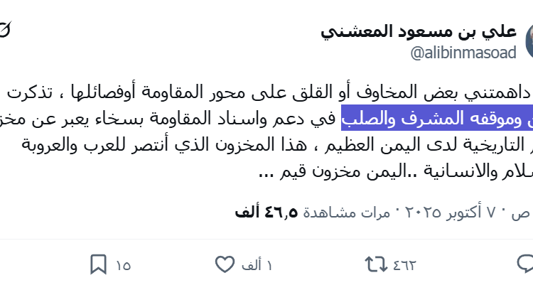 وقال المشعني في منشور له عبر مِنصة (إكس): «كلما داهمتني بعض المخاوف أَو القلق على محور المقاومة أَو حركاتها، تذكرت اليمن وموقفه المشرف والصُّلب في دعم وإسناد المقاومة بسخاء يعبر عن مخزون القيم التاريخية لدى اليمن العظيم، هذا المخزون الذي انتصر للعرب والعروبة والإسلام والإنسانية».