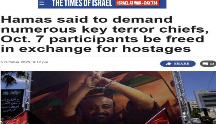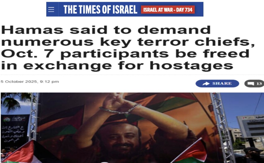 ذكرت القناة 14 العبرية، نقلًا عن تقارير إعلامية ودوائر تفاوضية، منها الموقع الصهيوني الأكثر شهرةً بالإنجليزية تايمر أوف يسرائيل أن قائمة المطالِب التي تطرحها الوساطاتُ لصفقة تبادل الأسرى بين ميان الاحتلال وحماس تضم أسماءً بارزة قد تصعّب التوصل إلى اتفاق سريع، أبرزهم: مروان البرغوثي، أحمد سعدات، حسن سلامة، وعبّاس السعيد.. أربعة أسماء تخضع جميعها لأحكام بالسجن لمدد طويلة قد تقترب أو تتجاوز عقودًا عديدة، بعضها يعرّفها الإعلام العبري بأنها تصل إلى «نحو مئة مؤبد» عند احتساب الأحكام المتعددة.