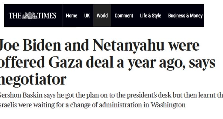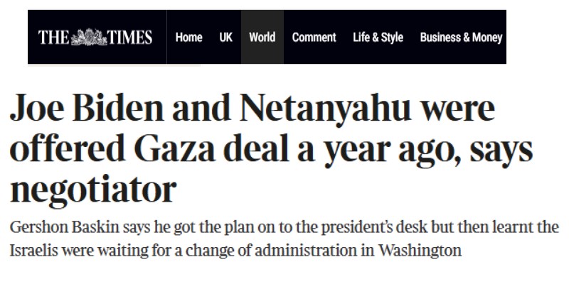 كشفت صحيفة التايمز البريطانية، في تقرير أعدّته مراسلتها في عمّان كاثرين فيلب، أنّ الاتّفاق الذي أنهى الحرب على غزة كان بالإمْكَان التوصّل إليه قبل أكثر من عام، لولا رفض رئيس وزراء الاحتلال الإسرائيلي بنيامين نتنياهو، وتجاهل إدارة الرئيس الأمريكي السابق جو بايدن للاقتراحات المطروحة آنذاك.