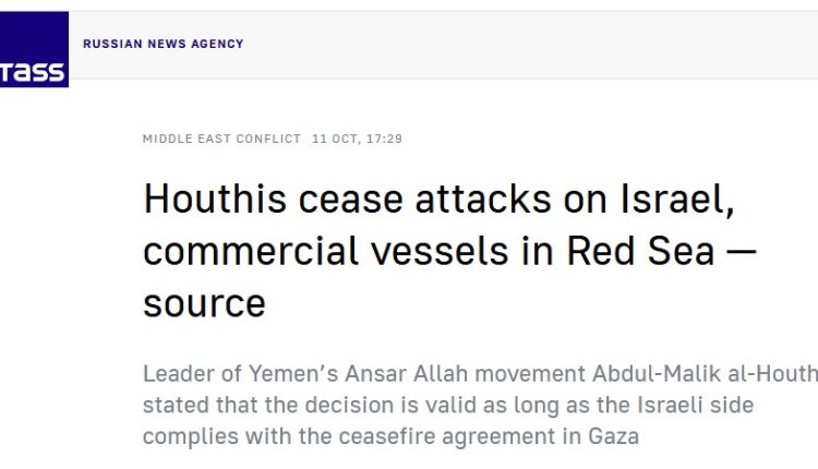 أفادت وكالة “تاس” الروسية للأنباء، نقلًا عن مصدر في حركة أنصار الله اليمنية، بأن قائد الحركة عبد الملك الحوثي أصدر تعليماتٍ بإيقاف جميع الهجمات على “إسرائيل” والسفن التجارية المرتبطة بها في البحر الأحمر وخليج عدن، شريطة التزام (إسرائيل) ببنود اتّفاق وقف إطلاق النار في قطاع غزة.
