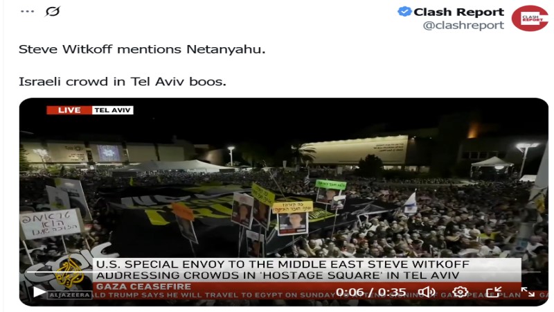 غير أن المشهد انقلب تمامًا عندما وجّه المبعوثُ الأمريكي شكره إلى نتنياهو ووزير الشؤون الاستراتيجية رون ديرمر؛ إذ دوّت في المكان صفاراتُ الاستهجان وصيحات الرفض؛ تعبيرًا عن الغضب الشعبي تجاه نتنياهو ودوره في الحرب على غزة.