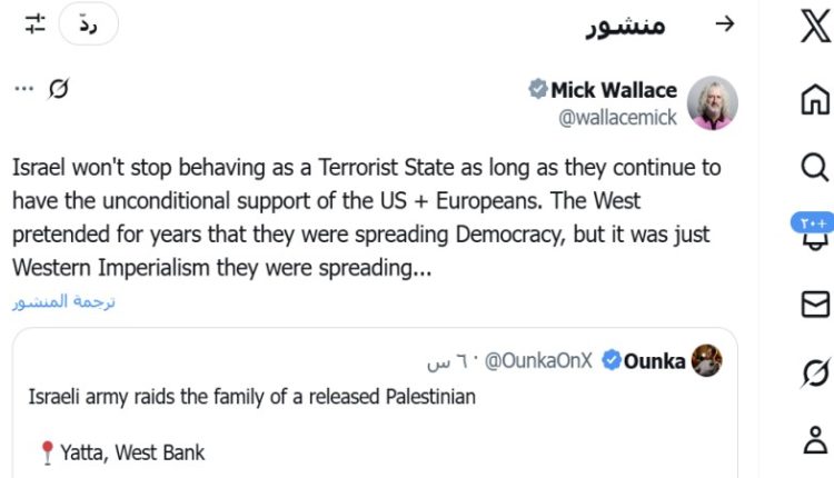 وصف السياسي الإيرلندي وعضو البرلمان الأوروبي السابق ميك والاس، الكيان الصهيوني بأنه “كيان إرهابي مريض لا يستحقُّ مكانًا في المجتمع الدولي”، في تصريح أثار تفاعلًا واسعًا داخل الأوساط الأوروبية.