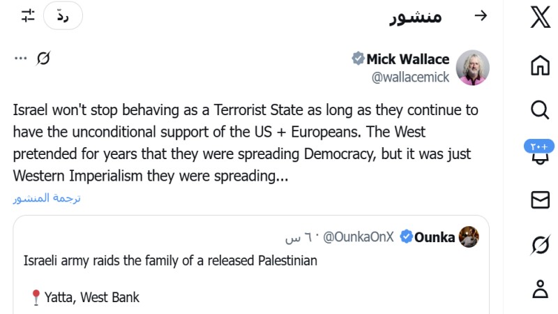وفي تدوينة نشرها على منصة X (تويتر سابقًا)، دعا والاس إلى عزل “إسرائيل” فورًا حفاظًا على ما تبقّى من القانون الدولي، مؤكدًا أن استمرار التعامل معها يمثل انهيارًا أخلاقيًا وقانونيًا خطيرًا، وأن تجاهل جرائمها المتكررة في غزة والضفة ينسف أسس العدالة الدولية التي يتغنى بها الغرب.