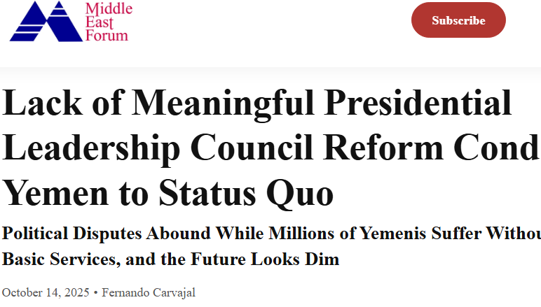 ولا يزال إصلاح مجلس القيادة الرئاسي خارج نطاق مصالح مقدميه، دون ذكر حتى خلال اجتماعات الجمعية العامة للأمم المتحدة في نيويورك الشهر الماضي.