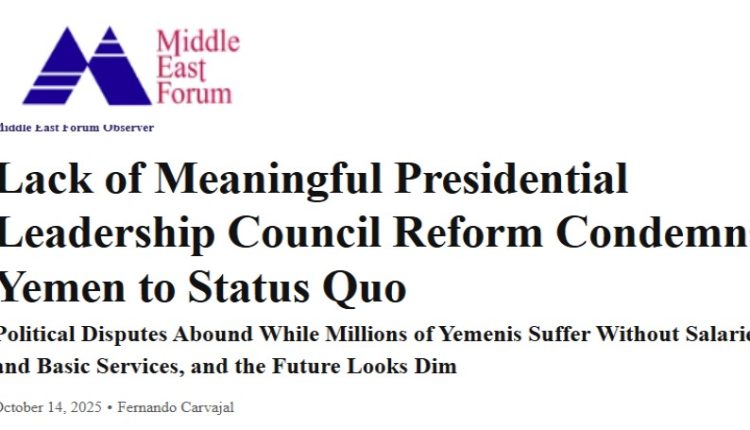 كشف مركز «ميدل إيست فورم» الأمريكي، في تحليل أعدّه الخبير فرناندو كرفخال -العضو السابق في لجنة الخبراء التابعة للأمم المتحدة المعنية باليمن- أن مجلس القيادة الرئاسي اليمني يعيش حالة من الشلل السياسي والانقسامات الحادة، في ظل غياب أي إصلاح فعلي وتراجع الاهتمام الدولي بملفه.
