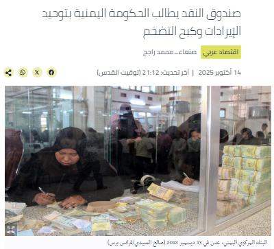 كذلك دعا السلطات اليمنية، ابتداءً من عام 2026، إلى ربط اعتمادات الصرف بتحويل الإيرادات من المحافظات فوراً، وتنفيذ خطة تعبئة الإيرادات الطارئة قصيرة الأجل المصممة بدعم من الصندوق، التي من شأنها المساهمة في زيادة الحصيلة العامة.