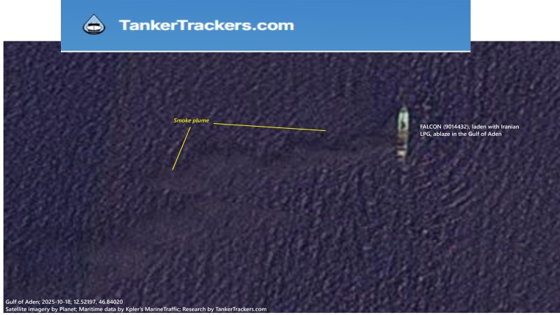 The LPG tanker FALCON (9014432), which caught fire today in the Gulf of Aden, was laden with Iranian LPG from Assaluyeh after loading there on 2025-09-25. She was most likely heading to Ras Isa, Yemen; to supply the Houthis. This vessel was detained in January 2025 in Istanbul… pic.twitter.com/D1kUoUADVi