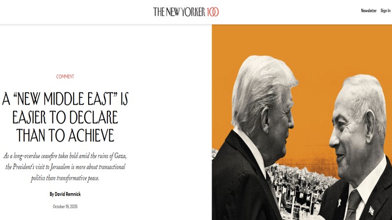 اعتبرت مجلة ذي نيويوركر الأمريكية، في مقال للصحفي ديفيد ريمنيك، أن زيارة الرئيس الأمريكي دونالد ترامب إلى كيان الاحتلال ومصر لم تكن رحلة للسلام التحويلي، بل تحَرّك سياسي قائم على المصالح والصفقات، وأن إعلان “شرق أوسط جديد” يبقى بعيد المنال.