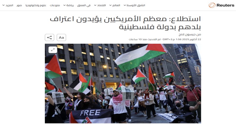 أظهر استطلاع أجرته وكالة رويترز أن غالبية الأمريكيين يؤيدون اعتراف الولايات المتحدة بدولة فلسطينية، في موقف يعكس اتساع الفجوة بين توجهات الرأي العام والسياسات الرسمية السابقة.
