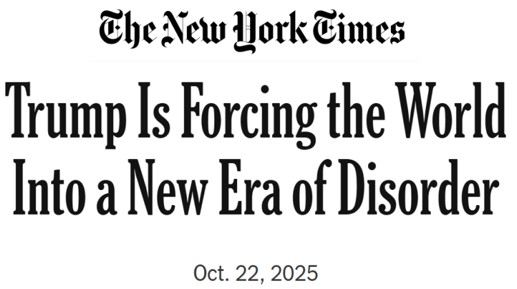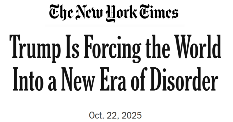 قالت صحيفة نيويورك تايمز الأمريكية إن سياسات الرئيس الأمريكي دونالد ترامب تعيد تشكيل النظام الدولي بطريقة تهدّد بإغراق العالم في مرحلة جديدة من الفوضى، مشيرة إلى أن أُسلُـوبه الأحادي في إدارة الملفات الاقتصادية والسياسية والعسكرية يقوّض الأسس التي قامت عليها القيادة الأمريكية للعالم منذ نهاية الحرب العالمية الثانية.