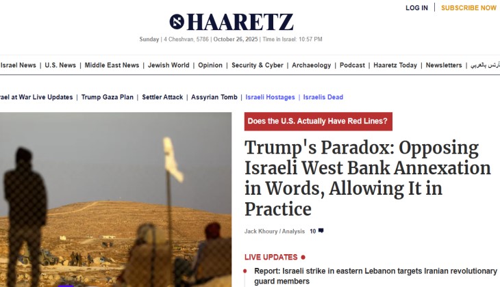 نشرت صحيفة هآرتس العبرية مقالًا تحليليًّا للكاتب الصهيوني جاك خوري تناول فيه ما وصفه بـ“مفارقة ترامب” في التعامل مع ملف الضفة الغربية، مُشيرًا إلى أن إدارة الرئيس الأمريكي عارضت ضم الأراضي الفلسطينية “قولًا”، لكنها سمحت به “فعلًا” على الأرض.