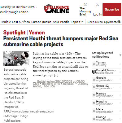 نشرت دورية انتيليجنس أون لاين الفرنسية المتخصصة في شؤون الاستخبارات والدفاع والأمن تقريراً بعنوان “التهديد المستمر يعرقل مشاريع كابلات الألياف البصرية في البحر الأحمر” للكاتبين جيرمي اندرو ، وثيو سو ضمن سلسلة من ثلاثة أجزاء تتحدث عن تأثير الصراع اليمني على البنية التحتية الرقمية الدولية في البحر الأحمر.