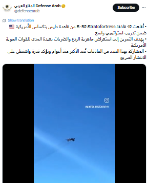 وأضاف: أقلعت 12 قاذفة B-52 Stratofortress من قاعدة دايس بتكساس الأمريكية 🇺🇸 ضمن تدريب استراتيجي واسع.