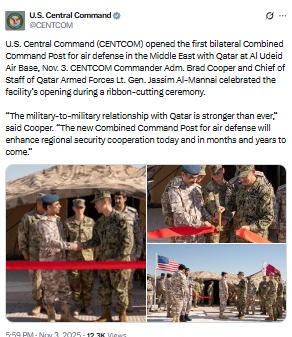 افتتحت القيادة المركزية الأمريكية (CENTCOM) أول مركز قيادة مشترك للدفاع الجوي في الشرق الأوسط بالتعاون مع قطر، وذلك في قاعدة العديد الجوية.