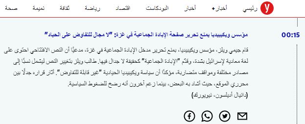 وطالب ويلز بتغيير النص ليشمل نسبًا إلى مصادرَ مختلفة ومواقف متضاربة، متذرعًا أن سياسة ويكيبيديا الحيادية “غير قابلة للتفاوض”.