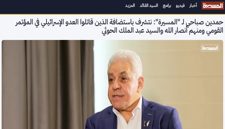 أكَّدَ الأمينُ العامُّ للمؤتمرِ القوميِّ العربيِّ والسياسيُّ المصريُّ الكبيرُ حمدينُ صباحيْ أنَّ المكانَ الطبيعيَّ لليمنِ والسيدِ القائدِ عبدِ الملكِ بدرِ الدينِ الحوثيِّ في المؤتمرِ القومي الرابع، الذي تتوافقُ أفكارُه وآراؤُهُ معَ أنصارِ اللهِ في العداءِ لكيانِ العدوِّ الإسرائيليِّ، وفي تبنّيِ المقاومةِ كنموذجٍ ملهمٍ لدعمِ فلسطينَ.