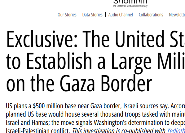تقول مصادر إسرائيلية إن الولايات المتحدة تخطط لبناء قاعدة بقيمة 500 مليون دولار بالقرب من غلاف غزة.