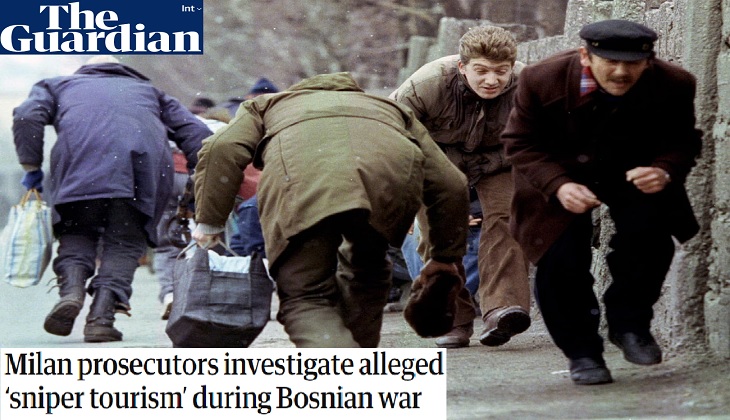 كشفت صحيفة الغارديان البريطانية عن تحقيق يجريه الادِّعاء العام في ميلانو بشأن جرائم مروّعة تعود إلى تسعينيات القرن الماضي، يُشتبه في أن أثرياء أُورُوبيين شاركوا فيها تحت ما عُرف بـ“سياحة القناصة”، حَيثُ دفعوا أموالًا لجنود صرب مقابل السماح لهم بقتل مدنيين بوسنيين خلال حصار سراييفو.