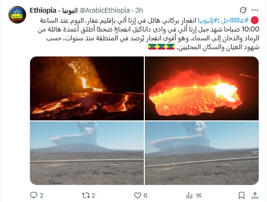 وفي السياق ذاته، أعلنت السلطاتُ الإثيوبية عبر حساباتها الرسمية على مواقع التواصل الاجتماعي وقوعَ انفجار بركاني هائل في بركان “إرتا ألي” عند الساعة العاشرة صباحًا.