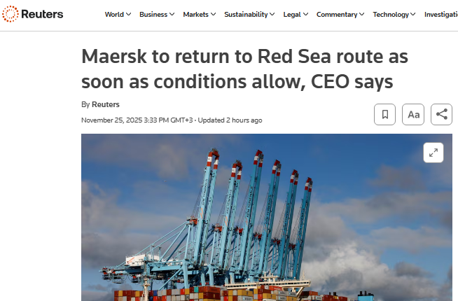أعلنت شركة الشحن الدنماركية ميرسك وهي احدى اكبر شركات شحن الحاويات في العالم أنها تفكر بجدية في اتخاذ خطوات لاستئناف الملاحة عبر البحر الأحمر نحو قناة السويس في أقرب وقت تسمح به الظروف، حسبما قال الرئيس التنفيذي للشركة فينسنت كليرك اليوم الثلاثاء.