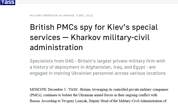 وأشار المسؤول العسكري الروسي الى لندن تواصل عبر شركاتها العسكرية الخاصة، دعم العمليات العسكرية الأوكرانية ضد موسكو بنشاط عبر العديد من شركات عسكرية بريطانية معروفة مثل G4S، Control Risks، Pilgrims Group، Hawki Worldwide، Prevail Partners،.