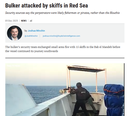 قالت منصة لويدز ليست الملاحية العالمية أن ناقلة بضائع تعرضت إلى مطاردة وإطلاق نار من قبل 15 زورقا صغيرا في جنوب البحر الأحمر.
